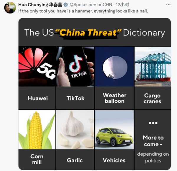 华春莹最后回击,“如果你唯一的工具是锤子,那么所有东西看起来都像钉子。”这条帖文随附图片上,列出美国以往炒作“中国威胁”的词典:包括华为,TikTok,气象无人飞艇,起重机,玉米加工厂,大蒜,汽车……还有更多,取决于政治因素。↓