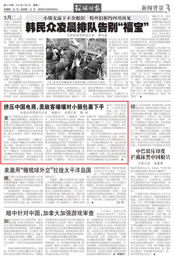 复旦大学美国研究中心副主任宋国友3日告诉《环球时报》记者,美国个别政客不断叫嚣打压中国跨境电商平台,不仅是冲着电商本身,而且是在遏制中国的大背景下,认为跨境电商成为他们的一个“漏洞”,需要赶紧封堵。如果未来美国修改相关规则甚至取消“小额豁免”机制,那么美国普通消费者恐怕将面临更高昂的购物成本,美国相关的运输物流业也会受到影响。