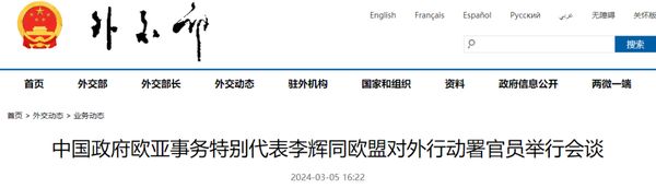 中国政府欧亚事务特别代表李辉同欧盟对外行动署官员举行会谈2024年3月4日,中国政府欧亚事务特别代表李辉抵达布鲁塞尔,……