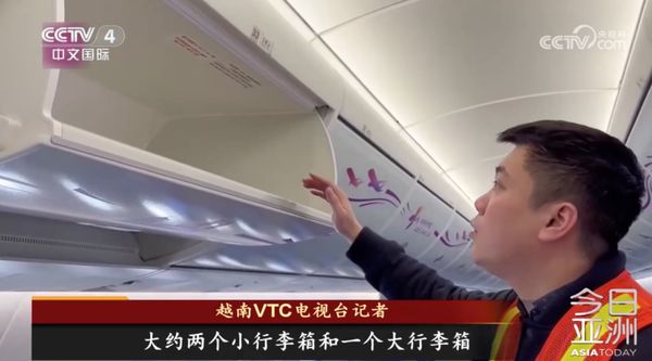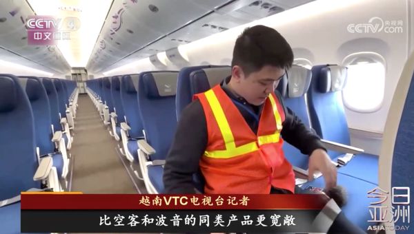 除了C919宽敞的座位,越南媒体记者对于飞机上的每个细节都很有兴趣。