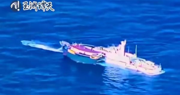 3月5日,菲律宾擅闯中国南沙群岛仁爱礁邻近海域。媒体拿到的影像证据显示,菲方船只危险接近我海警21551艇,并遭中国海警警示性水炮喷射。图源:玉渊潭天视频截图