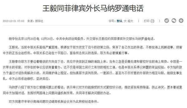 2023年12月21日,中菲两国外交部长通话(图片来源:中国政府网截图)