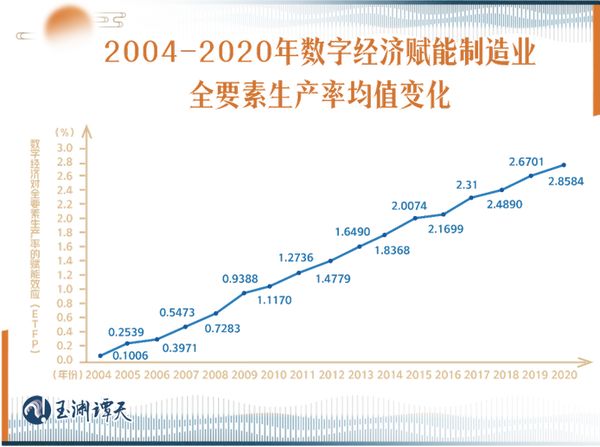 有学者做过测算,从2004年开始到2021年,数字经济赋能制造业全要素生产率效能呈逐年上升的趋势,且近年来,赋能均值达到了最高点。