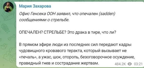 扎哈罗娃23日在“俄罗斯24”频道的节目中称,西方国家最初并不打算谴责恐怖袭击,仅限于泛泛地表示遗憾和同情。“世界大多数国家迫使他们改变了自己的措辞,甚至在昨天傍晚和晚上,他们匆忙改写了新闻稿。今天上午,我们甚至开始收到来自西方国家的额外信号,表示他们一定会加强他们在此问题上的措辞。”