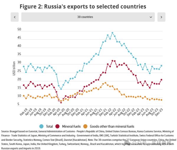 俄罗斯到38国出口额走势图。数据显示,俄乌冲突至今,俄罗斯的外贸保持了平稳。红色为化石燃料出口,黄色为除此以外的其他出口产品