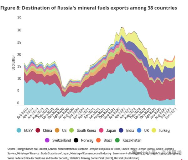 2019年2月到2023年12月,俄罗斯化石燃料出口目的地份额变化图,图中显示,俄乌危机后,中、印、土耳其份额增加明显