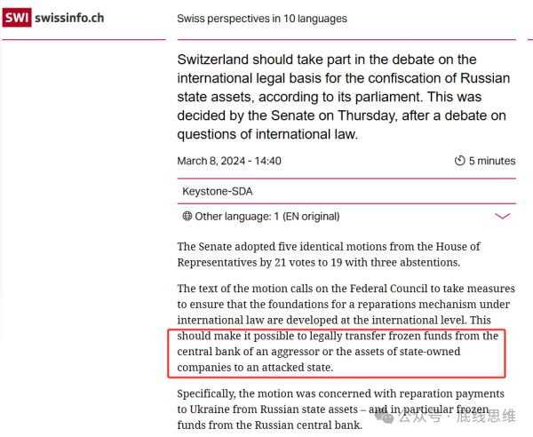瑞士议会通过一项动议,使得瑞士银行冻结的俄罗斯中央银行的国家资产可以被“合法”没收,用于补偿乌克兰