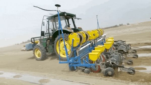 每年春天,棉农需要选择温度适宜的时期播下种⼦。在“超级棉⽥”里,我们两位管理者利⽤⼟壤监测仪便可获知科学准确的棉花播种⽇期;同时利用遥感无人飞机和农机自驾仪改善整地问题,其中装配我们农机⾃驾仪的播种机⼀键启动,就能实现精准、⾼效的⾃动化作业,减少⼈⼒投⼊。