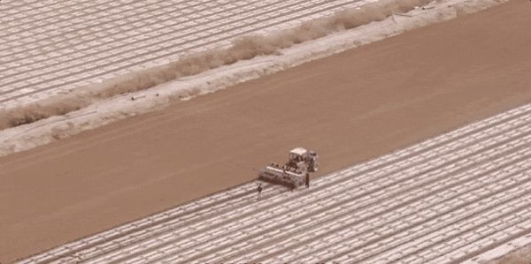 干播这个技术是指,“超级棉田”不冬灌也不春灌,等到春天地温连续5天达到12度以上,或者地温连续3天达到14度以上的时候,直接铺膜,之后点棉花种子,播完种子后,接上软带滴灌带,进水滴水——滴水的目的是让这个种子立马可以喝到水进而萌发。