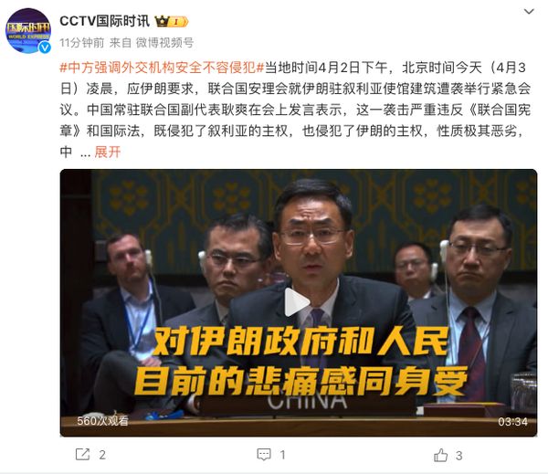 当地时间4月2日下午,北京时间今天(4月3日)凌晨,应伊朗要求,联合国安理会就伊朗驻叙利亚使馆建筑遭袭举行紧急会议。中国常驻联合国副代表耿爽在会上发言表示,这一袭击严重违反《联合国宪章》和国际法,既侵犯了叙利亚的主权,也侵犯了伊朗的主权,性质极其恶劣,中方对此予以强烈谴责。25年前,中国驻南联盟大使馆曾遭到以美国为首的北约空袭,造成人员伤亡和馆舍损毁。中方对伊朗政府和人民目前的悲痛感同身受,对伊朗政府和人民表示深切的同情和慰问。