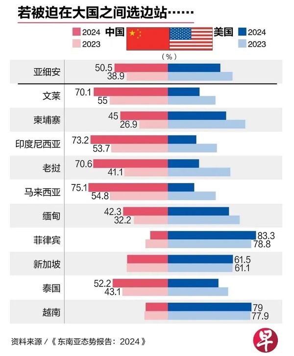 报告发现,若被迫在中美之间选边站,今年有更多的东南亚受访者选择中国,从去年的38.9%上升至50.5%。《联华早报》指出,这是2020年调查增设这道问题以来,中国首次超越美国成为首选。
