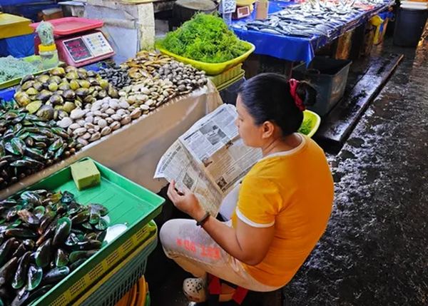 在远离南海争议地区的菲律宾棉兰老岛达沃市,海鲜市场中的商户也在关注着菲海岸警卫队在南海争议地区的行动(拍摄:樊巍)