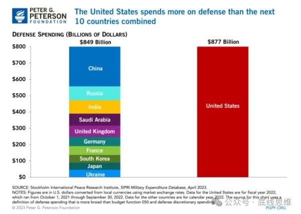 美国国防支出超过位列其后的十个国家的总和。图/美国彼得·G·彼得森基金会