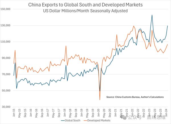 如果中国对美国的出口下降了,那么中国的出口走向何方?在过去几年中,中国对发达国家市场(美国、欧洲、日本和澳大利亚)的出口几乎没有增长,而对全球南方市场(包括俄罗斯、波斯湾国家、中亚、韩国和台湾)的出口却增长了约一倍。这是世界贸易模式史无前例的转变,在某种程度上可说是过去十年中最重要的经济事件。
