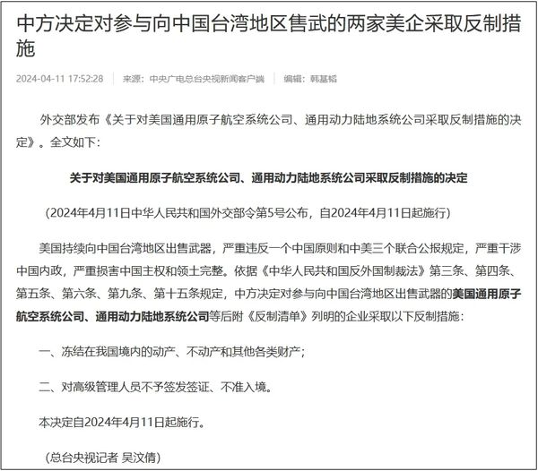 4月11日,外交部宣布对美国通用原子航空系统公司与通用动力陆地系统公司进行制裁(图片来源:国际在线截图)