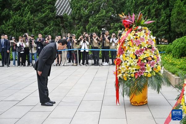 4月3日,马英九向黄花岗七十二烈士墓敬献花篮后鞠躬。(图片来源:新华社)