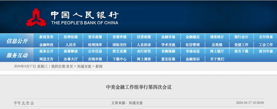 2024年4月16日,中美金融工作组在美国华盛顿举行第四次会议。会议由中国人民银行副行长宣昌能和美国财政部助理财长奈曼共同主持。国家金融监督管理总局、中国证监会,以及美联储、美国证券交易委员会、美国商品期货交易委员会、联邦存款保险公司等部门参会。美国财政部部长耶伦会见了中美金融工作组中方代表团。