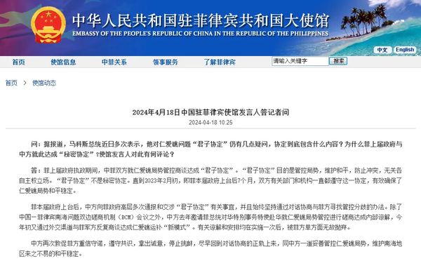 据中国驻菲律宾大使馆网站消息,4月18日,中国驻菲律宾使馆发言人答记者问。