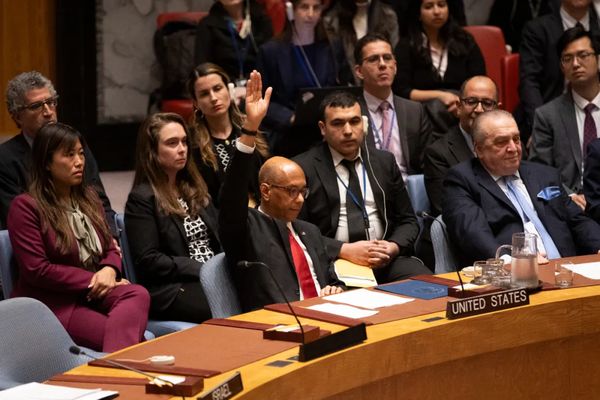 4月18日,在位于纽约的联合国总部,美国常驻联合国副代表罗伯特·伍德(前左)在安理会就决议草案进行表决时投反对票。新华社记者 谢锷 摄