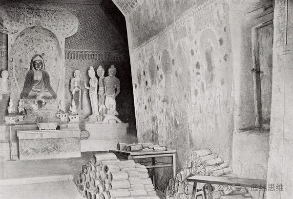 斯坦因1907拍摄的藏经洞和经卷 图片来源:敦煌研究院