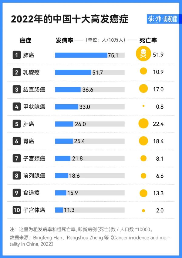 只是相比全球整体,肺癌在中国的疾病负担更为突出。整个 2022 年,国内新增肺癌患者达到了 106.1 万例,相当于每 10 万人中就有 75.1 人罹患肺癌。