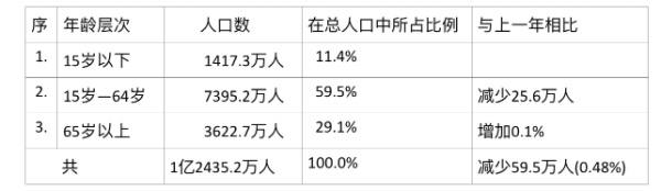 不包括合法居留的外国人人数,日本本国公民人数为1亿2119万3000人,与上一年相比减少83.7万人(占0.69%的比例)。而65岁以上的人口有3622万7000人,占全国总人口的29.1%,这与上一年相比增加了0.1%。