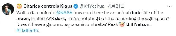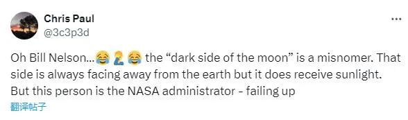 他的这一说法也迅速引来网友的质疑和驳斥。有网友直言:“比尔·尼尔森你这家伙是白痴吗?”也有网友指出,比尔·尼尔森的“月球背面永远处于黑暗”的说法明显用词不当,月球背面虽然始终背对地球,但是有阳光照射的。还有网友调侃说:“难道月球上是有一把大伞吗。”