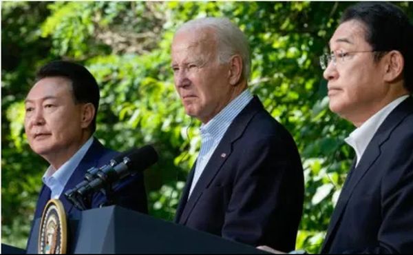 2023年8月18日,韩国总统尹锡悦、美国总统拜登、日本首相岸田文雄出席在戴维营举办的联合记者会图源:美媒