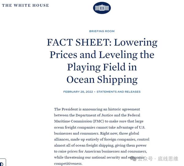 指责中国控制运费和运力分配,看看美国自己:2022年2月28日,美国司法部与联邦海事委员会(FMC)达成一项名为《降低海运价格和平衡海运市场的事实陈述》的协议,要求对班轮公司采取行动降低海运价格、提高在美国的运力。这条新闻至今还挂在白宫的网站上。现在美国更是通过《海运改革法案》,对疫情期间已经完成交易的运价进行干预,掀起一轮托运人对班轮公司的诉讼狂潮。