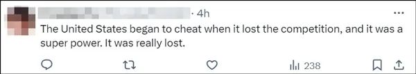 “当美国在竞争中竞争中失利时,它就开始作弊。”网友感叹说,这才是真正的输了比赛。