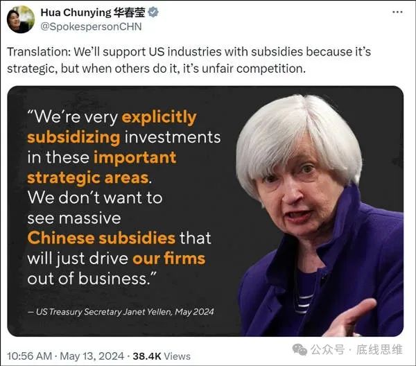 华春莹在“X”上发文回应道:“翻译一下(耶伦的话):我们(美国)会用补贴支持美国产业,因为这是战略性的,但当别人这么做时,就是不公平竞争。”