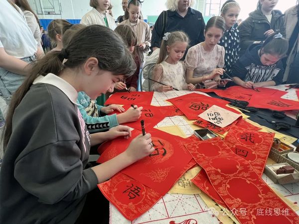 2024年4月20日,国际中文日活动在莫斯科548学校举办。图为俄罗斯小朋友在中国文化体验区学习毛笔书法。图自IC photo