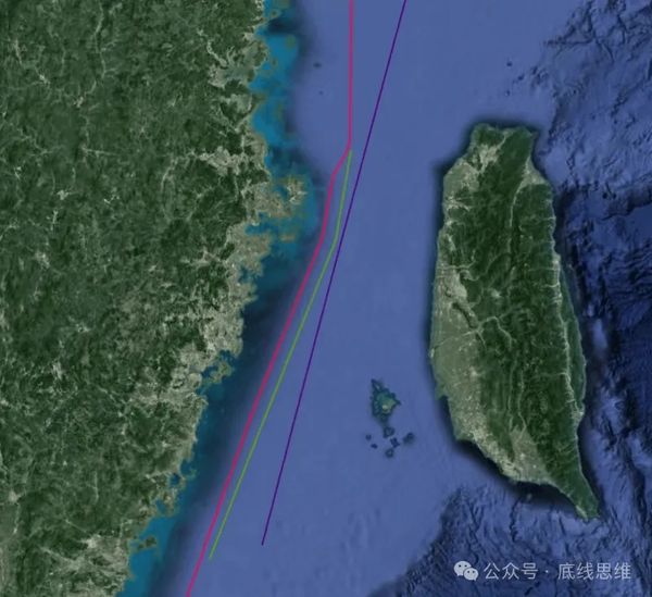 1月30日,中国民航局宣布将从2月1日起取消M503航线自北向南的飞行偏置,并启用M503航线的W122、W123衔接航线的由西向东运行。图中紫色为台湾当局所谓的“海峡中线”,红色为先前经由M503偏置航线飞行的实际航线,而绿色是现在开始启用的原始M503航线