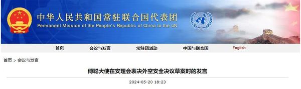 2024年5月20日,安理会就俄罗斯、中国共提的外空安全决议草案采取行动,决议草案以7票赞成、7票反对、1票弃权的结果未获通过。中国常驻联合国代表傅聪大使出席会议并发言。发言全文如下: