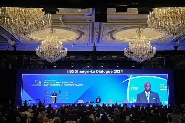 当地时间2024年6月1日,新加坡,美国国防部长奥斯汀发表演讲。(视觉中国)