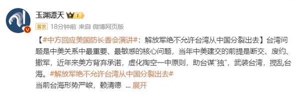 中方回应美国防长“香会”演讲:解放军绝不允许台湾从中国分裂出去