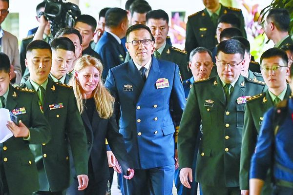 5月31日,正在新加坡出席第21届香格里拉对话会的国防部长董军与美国国防部长奥斯汀举行会谈。图为会谈结束后,董军一行离开会场。(法新社)