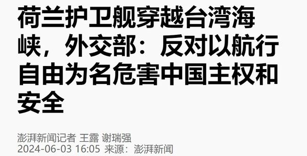 荷兰护卫舰穿越台湾海峡,外交部:反对以航行自由为名危害中国主权和安全6月3日,外交部发言人毛宁主持例行记者会。……