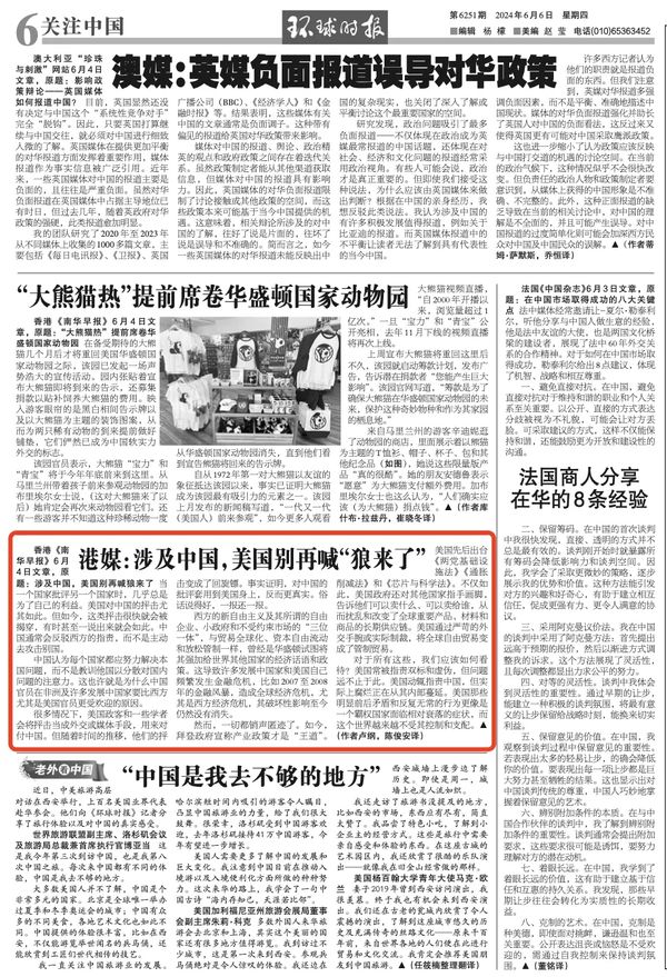香港《南华早报》6月4日文章,原题:涉及中国,美国别再喊狼来了