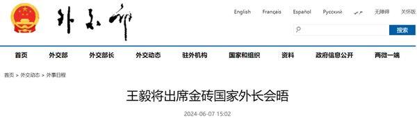 中共中央政治局委员、外交部长王毅将于6月10日至11日应邀赴俄罗斯下诺夫哥罗德出席金砖国家外长会晤。