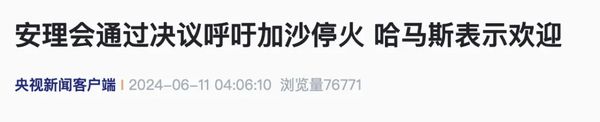 当地时间6月10日,联合国安理会表决通过美国提交的一份加沙地带相关决议,呼吁巴勒斯坦伊斯兰抵抗运动(哈马斯)和以色列接受停火协议。