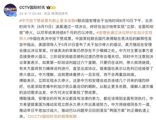 联合国安理会于当地时间6月10日下午、北京时间今天(6月11日)凌晨通过一项决议,呼吁在加沙地带实现“立即、全面和彻底”停火,以尽早结束持续8个月的巴以冲突。#安理会通过决议呼吁在加沙实现停火#中国在表决中投下赞成票。中国常驻联合国代表傅聪在表决后的解释性发言中指出,美国领导人于5月31日宣布了关于加沙停火的倡议,美方随后在安理会提出决议草案。付诸表决的草案仍然存在不少模糊之处。中方对主要当事方是否接受停火倡议、三阶段安排能否顺利过渡仍然有合理关切。同时中方注意到决议草案表示,如果第一阶段谈判超过六个星期,只要仍在谈判,停火就将继续,有关方面将努力确保谈判进行,直至达成协议。提案国也表示以色列已经接受了停火倡议。中方理解,这就意味着停火一旦实现,将不会再重启战端。