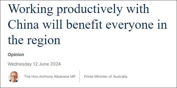 在国务院总理李强访澳前夕,当地时间6月12日,澳大利亚总理阿尔巴尼斯在《澳大利亚人报》(The Australian)发表题为《与中国有效合作将使区域内所有人受益》的署名文章。他表示,李强总理此访是2017年以来中国总理首次访问澳大利亚,标志着澳政府重建澳中对话和稳定两国关系的努力又向前迈出了一步。