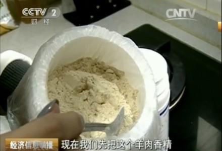 央视报道称,在四川成都市一食品批发市场,记者走进一家售卖食品添加剂的店铺,欲了解和羊肉汤调料有关的情况。老板立即向记者推荐起来,“有羊粉(羊肉香精),有羊汤增白剂”,说着便从货架上拿出一桶两斤装的售价为45元的羊肉香精。当记者询问用量时,该老板称,“千分之三的比例,你觉得味道不浓,加点点就是了。”