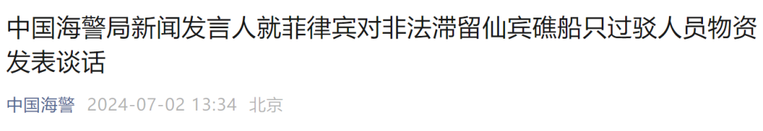 中国海警局新闻发言人刘德军表示,7月1日,菲律宾派3艘海警船对其非法滞留仙宾礁的海警9701舰过驳人员物资,中国海警全程跟监管控。中国对包括仙宾礁在内的南沙群岛及其附近海域拥有无可争辩的主权。菲方船只滞留仙宾礁,侵犯中国领土主权和海洋权益,违反《南海各方行为宣言》,破坏南海和平稳定,中方坚决反对。中国海警将一如既往在管辖海域维权执法,坚决捍卫国家领土主权和海洋权益。