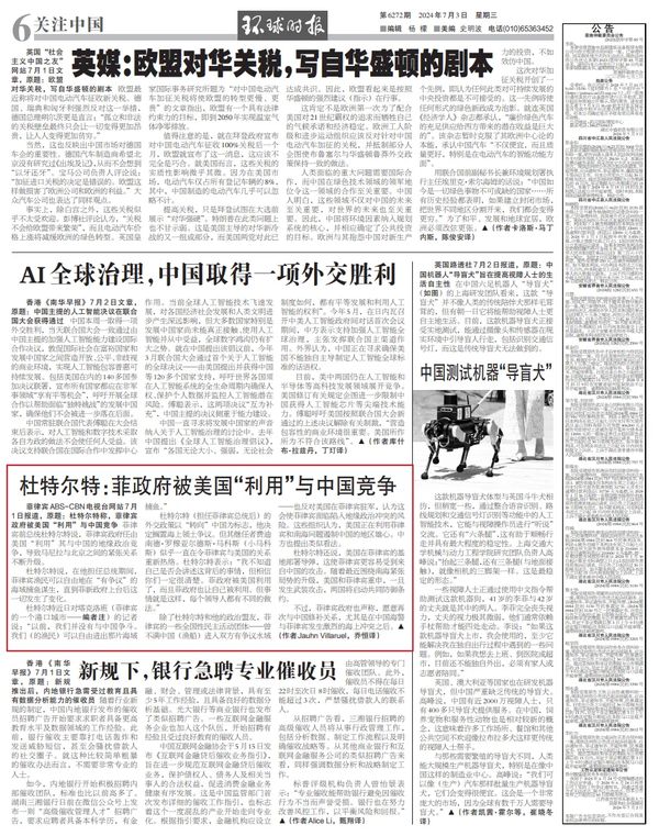 菲律宾ABS-CBN电视台网站7月1日报道,原题:杜特尔特称,菲律宾政府被美国“利用”与中国竞争