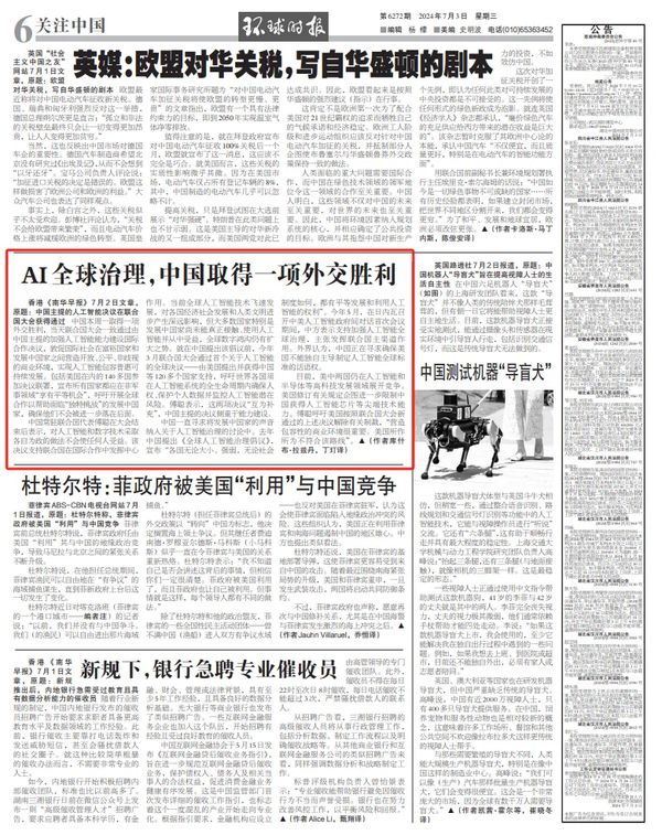 香港《南华早报》7月2日文章,原题:中国主提的人工智能决议在联合国大会获得通过