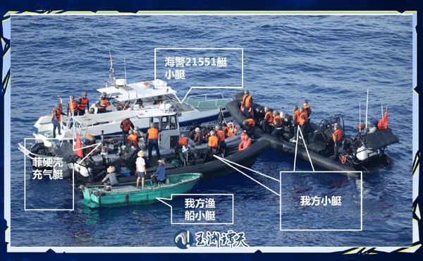 中国海警执法的现场图片。图中可见,菲方的硬壳充气快艇被我方多艘小艇团团围住,接受我方的登临检查。微信公众号“玉渊谭天”