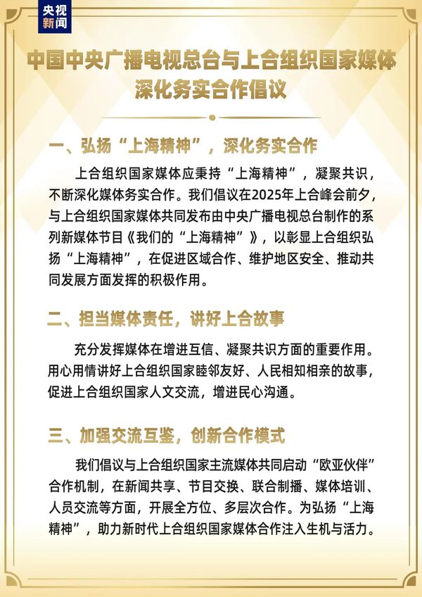 活动上,《中国中央广播电视总台与上合组织国家媒体深化务实合作倡议》发布。未来各方将秉持 “上海精神”,在2025年上合峰会前夕共同发布由总台制作的系列新媒体节目《我们的“上海精神”》。同时,共同启动“欧亚伙伴”合作机制,在新闻共享、节目交换、联合制播、媒体培训、人员交流等方面开展全方位、多层次合作,为助力上合组织国家间人文交流互鉴和民心相通贡献媒体力量。