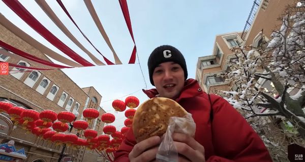 他走在乌鲁木齐白雪皑皑的街道上,来到大巴扎步行街尝试新疆特色的奶茶和馕,并用英语对着镜头说:“我注意到,这里所有的路标,不仅是店铺招牌,都是既写有汉语、又写有维语的。”